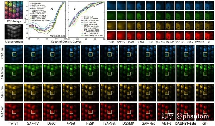 在仿真数据集上的定性结果对比如图5所示。左上角是RGB图像和快照估计图(Measurement)。下方四行图像是不同方法重建的四个波长下的高光谱图像。右上角的图像是下方图像中黄色框框内的放大图。从重建的高光谱图像来看,我们的方法能更好地恢复出细节内容和纹理结构,请注意对比小立方块区域。a 和 b 曲线对应着 RGB 图像的两个绿色框的区域的光谱强度曲线,可以看出,我们的 DAUHST 与 Ground Truth 的曲线最为接近。
