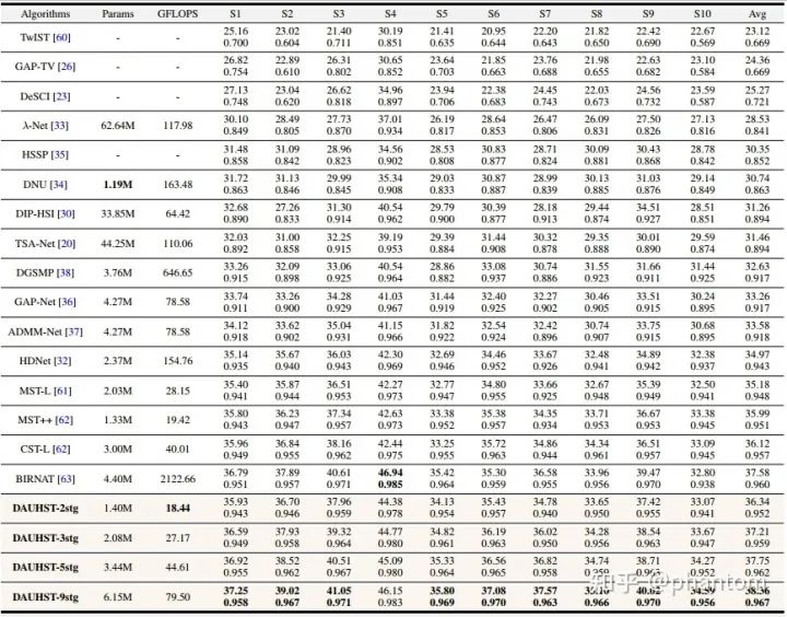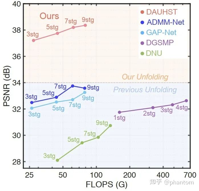 相较于先前的 Deep Unfolding 方法,我们绘制了 PSNR - FLOPS 坐标图比较 DAUHST 和其他 Deep Unfolding 方法的 性价比。如图4所示。我们的方法在消耗相同计算量的情况下比先前方法要高出 4 dB。