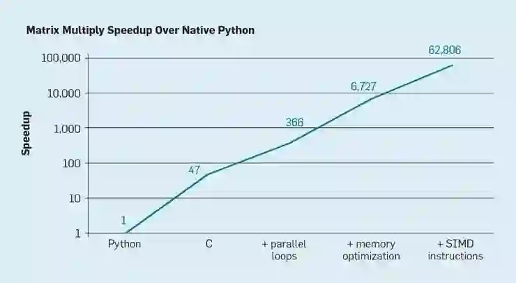 Python 是一种当前火热的编程语言,也是一种典型的高级、动态类型语言。如下面图 7,仅仅是把本来用 Python 编写的程序用 C 语言重新写一遍,就可以把程序的性能提高 47 倍。在多核心处理器上并行运行多个循环可以继续得到大约 7 倍的性能提升。优化程序的存储布局,让程序使用处理器中的缓存(而不是外部安装的内存)可以提升 20 倍性能,最后,如果加入拓展的计算硬件,用能够在每个指令周期内计算 16 次 32 位运算的单指令多数据并行(SIMD)计算单元进行运算的话,我们还可以再把性能提高9倍。把以上这些改进全部用起来的话,
