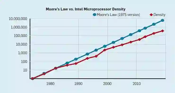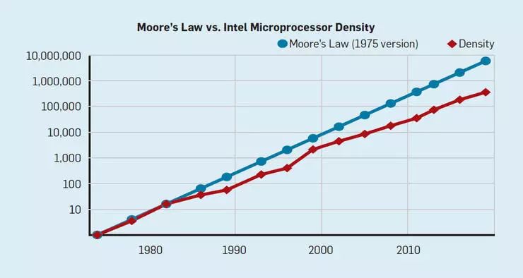 戈登·摩尔在1965年预测,集成电路的晶体管密度会每年翻一番,1975年又改为每两年翻一番,这一预测最终被称为摩尔定律。在这一预测中,晶体管密度呈二次增长,惊人的进化速度使架构师可以用更多晶体管来提高性能。