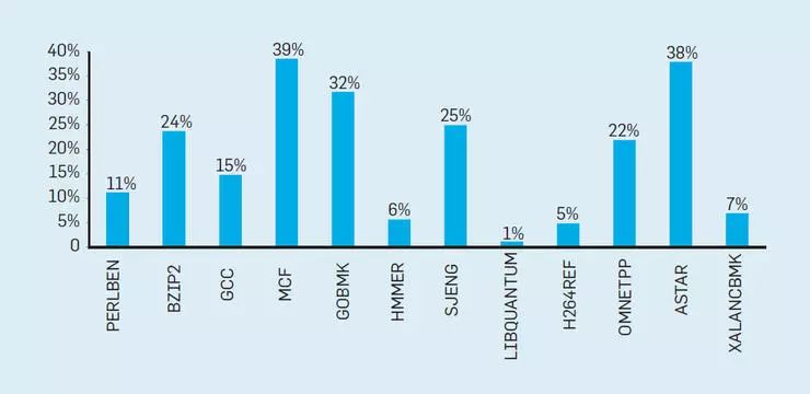 图4 不同的SPEC整型数基准测试,英特尔酷睿 i7 浪费的指令占完成指令总数的百分比