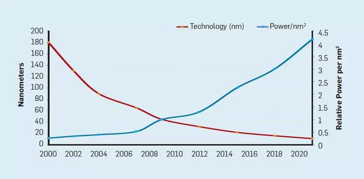 随着登纳德缩放定律的终结,芯片内核数量的增加意味着能耗也随之增加。不幸的是,进入处理器的电能有一部分会转化为热能,因此多核处理器受限于热耗散功率(TDP),即封装和冷却系统在最大负载时的驱散热量的最大限度。尽管一些高端数据中心可能使用更先进的封装和冷却技术,但没有一个计算机用户想要在自己桌子上放置小型热交换器,或者为手机增加散热器。TDP 的限制性直接导致了暗硅时代,也就是处理器通过降低时钟频率或关闭空闲内核来防止处理器过热。这种方法的另一种解释是:一些芯片可将其宝贵的能量从空闲内核转移到活跃内核。