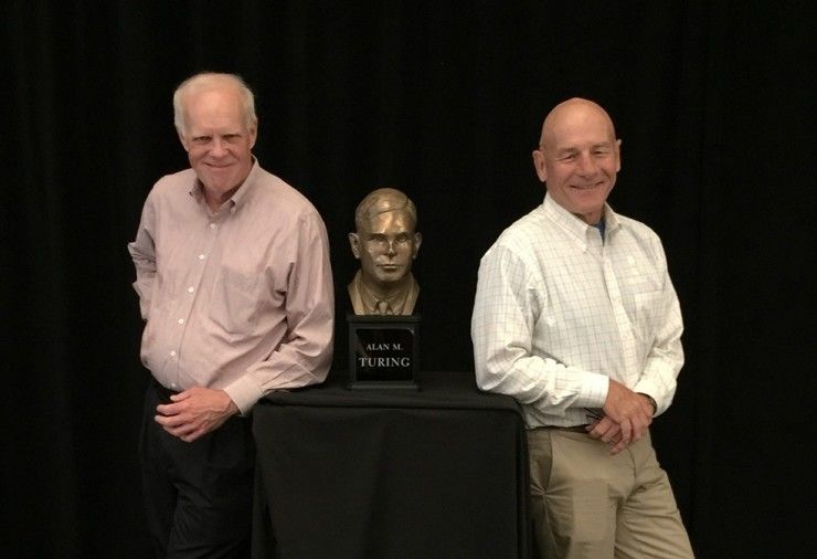 ISCA 2018 ,2017 图灵奖颁奖现场,John L. Hennessy(左) 和 David A. Patterson(右)与 Alan Turing 的半身像合影