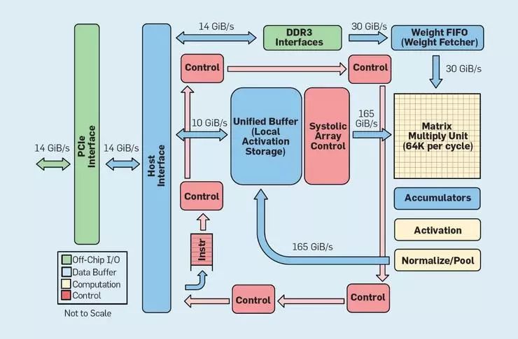 如下方图 8 所示,TPU 的内核结构设计和通用计算处理器完全不同。其中的主计算单元是一个矩阵计算单元,这是一个脉动列表结构,它可以在每个时钟周期进行一次 256x256 矩阵的乘法加法运算。在这项功能上联合使用的 8 位精度、高效率的脉动架构、SIMD 控制、专门划分出的一大片芯片面积,最终让这个乘法累加器的每时钟周期性能比一般的单核心通用计算 CPU 提升了大约 100 倍。而且,TPU 中并没有使用缓存,它使用的是大小为 24MB 的本地存储器,这相当于是 2015 年时期的相同功耗的 CPU 上带有的缓存空间的 2 倍。最后,激活值存储器和权重存储器(以及保留权重的 FIFO 架构)都通过一个用户控制的高带宽存储通道连接在一起。在基于谷歌数据中心的六种常见推理问题的加权性能统计中,TPU 要比通用计算 CPU 快 29 倍。由于 TPU 消耗的电能还不到 CPU 的一半,在处理这些负载时 TPU 的能量效率要比通用计算 CPU 高 80 倍还不止。