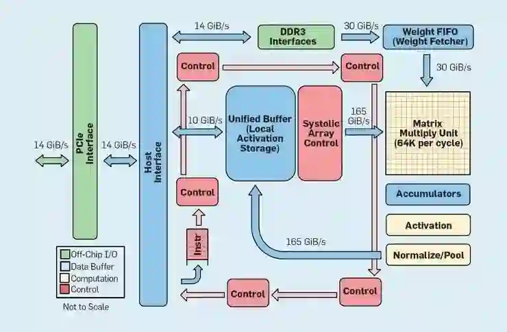 TPU - 谷歌 TPU 主要依赖其中的大规模二维脉动乘法累加器,以及依靠软件控制片上存储