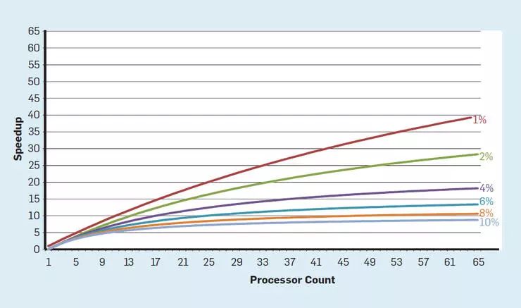 多核将识别并行性和决定如何利用并行性的任务转移给程序员和编程语言。多核并未解决节能的挑战,而这种挑战因登纳德缩放定律终结更加严峻。每个活跃的核都会消耗能量,无论其对计算是否有有效贡献。一个主要的障碍可以用阿姆达尔定律(Amdahl's Law)表述,该定理认为,在并行计算中用多处理器的应用加速受限于程序所需的串行时间百分比。这一定律的重要性参见图5,与单核相比,多达64个核执行应用程序速度的差别,假设串行执行的不同部分只有一个处理器处于活动状态。例如,如果只有1%的时间是串行的,那么 64核的配置可加速大约35倍,当然能量也与64个处理器成正比,大约有45% 的能量被浪费。