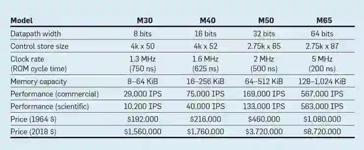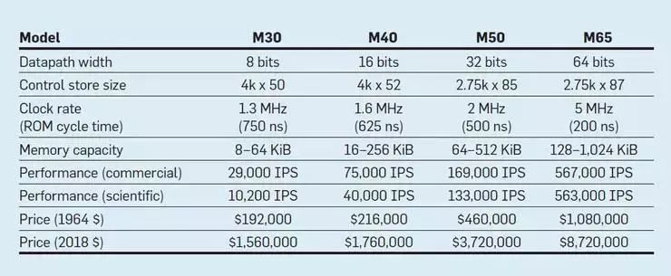 下图列出了IBM在1964年4月7日发布的新System/360系列计算机的指令集,四种型号之间的数据通路宽度相差8倍,内存容量相差16倍,频率相差近4倍,最终性能相差50倍。其中M65机型的控制存储器容量最大,成本和售价也最昂贵,而最低端M30机型的控制存储器容量最小,因此也需要有更多的微指令来执行System/360的指令。