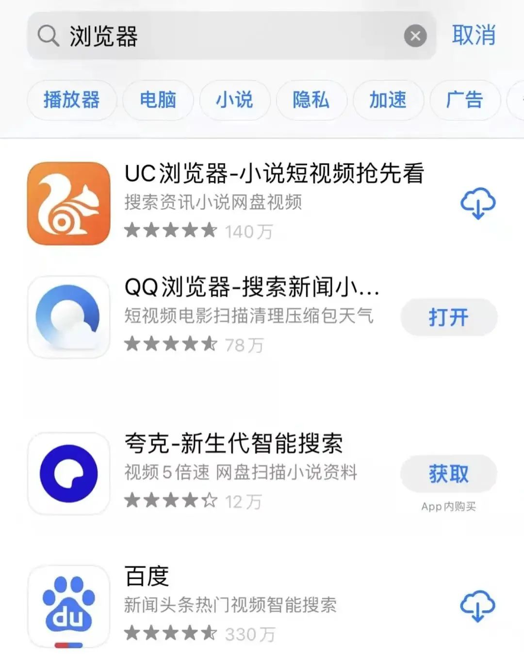 2月22日,在苹果应用商店中搜索“浏览器”,从上至下APP及其宣传语分别为: