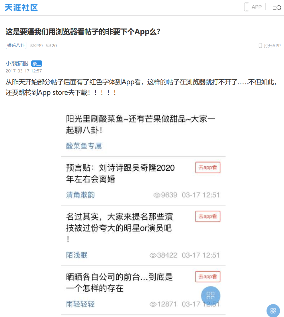 把时间拨回到2017年,有天涯论坛网友发帖称,一夜之间发现无法在浏览器里愉快地刷贴吧了。