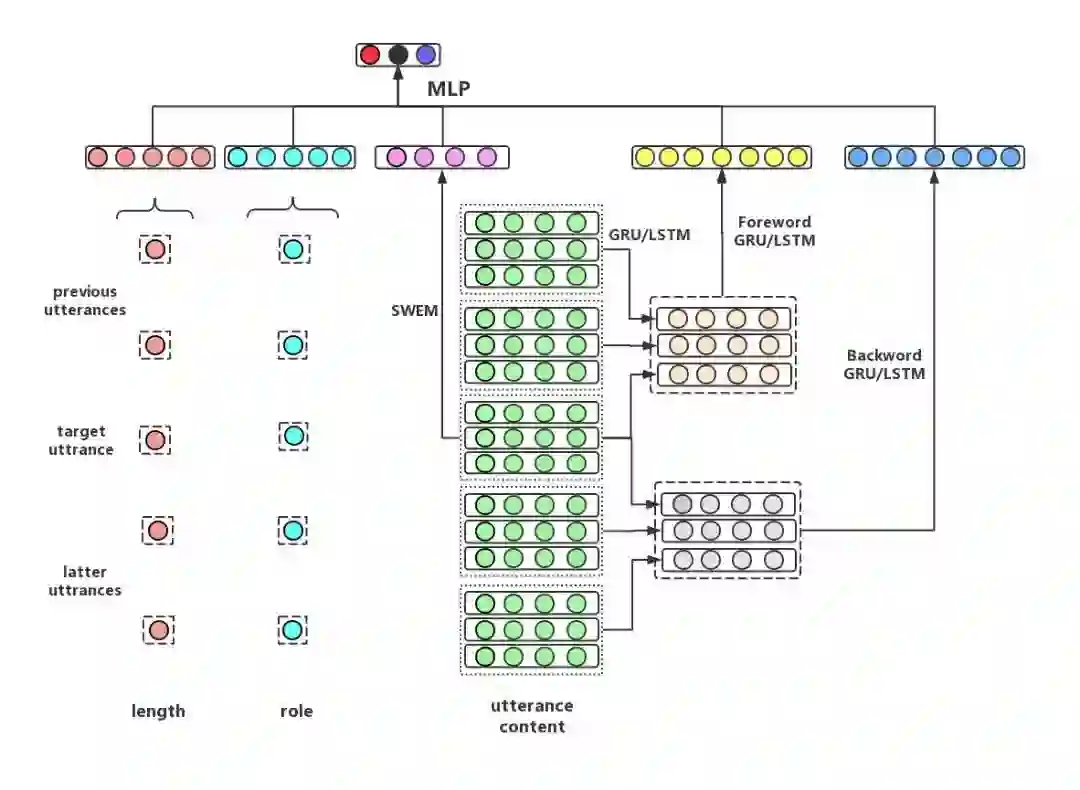 模型如下图,考虑了句子长度、说话人角色,以及内容的语义信息等等特征。