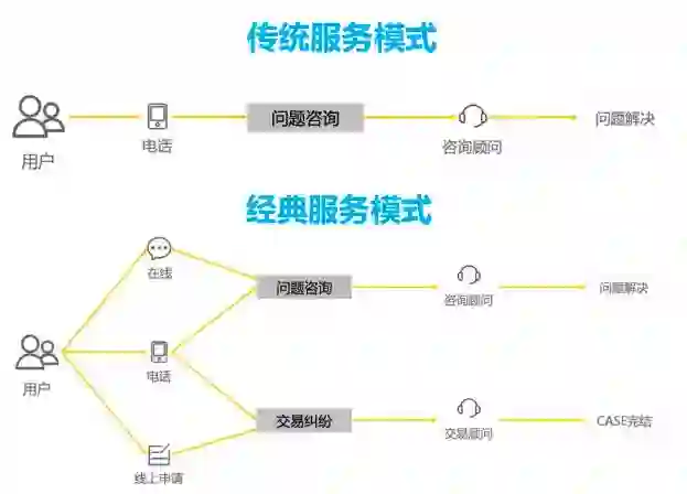 传统的客服模式始于电话客服,会有专业的咨询顾问帮客户解答问题。之后有了在线客服和线上申请,在线客服类似于文字聊天,线上申请是非实时的通讯方式,可以理解为类似留言或者邮件的形式。