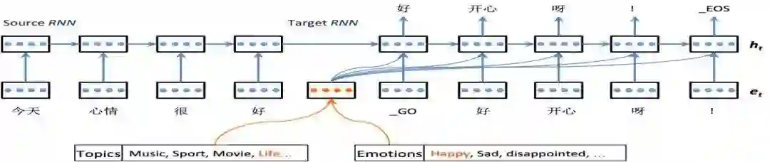 我们的目的是让机器人产生带情绪的回复,另外希望回复更具有针对性一些,而不是全部都是通用的 ’ safe response ',在下面的模型里,除了情绪,我们还可以添加 topic 相关的信息,分析出聊天的主题。下面的例子里,客户说今天心情很好,聊的是生活化的主题,表达的是高兴的情绪,这时候我们生成 ’ 好开心啊 ',回复用户。
