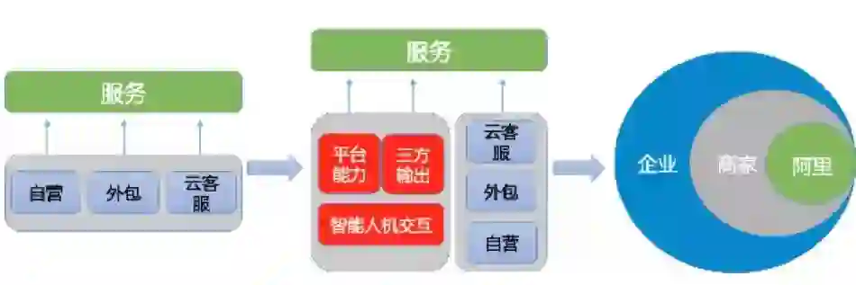 智能客服能力建立之前,人工服务的能力来自于自营客服、外包客服和云客服。模式升级之后,利用智能服务的能力,形成了平台能力、三方能力、智能人机交互这三种服务模式。服务的对象可以理解为三个层次,其中,阿里是包括指淘宝、天猫、咸鱼、淘票票等阿里巴巴内部产品平台的范围;商家是指依托于阿里巴巴淘宝和天猫等平台之上的外部商家;企业则是指纯粹外部的企业。