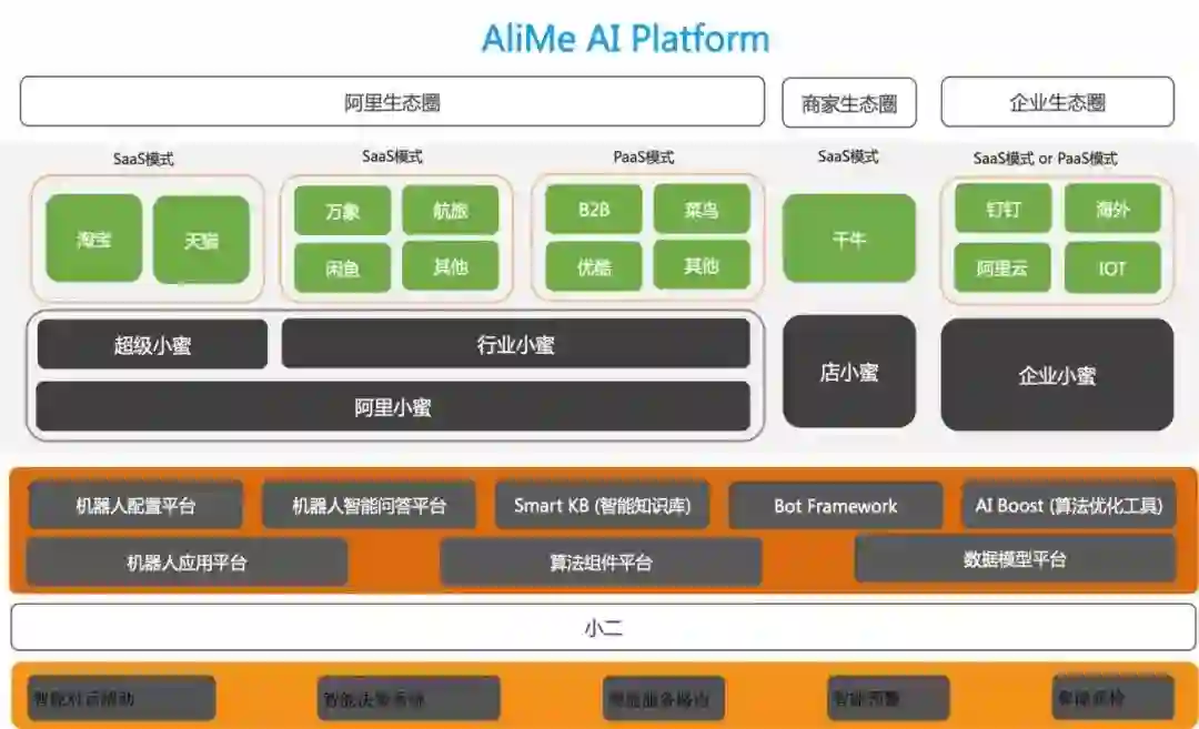 如图,最下面这层其实是为小二进行服务的,小二是阿里客服的简称。在上面机器人配置平台这一层是为机器人服务提供一些能力。再往上一层是按照产品进行划分,分成阿里小蜜、店小蜜和企业小蜜。阿里小蜜主要服务阿里内部的淘宝天猫这样平台,店小蜜服务阿里平台上的商家,企业小蜜服务于外部企业。