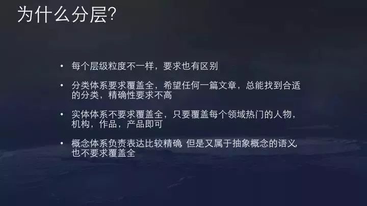 分类的目标是覆盖全面,希望每篇内容每段视频都有分类;而实体体系要求精准,相同名字或内容要能明确区分究竟指代哪一个人或物,但不用覆盖很全。概念体系则负责解决比较精确又属于抽象概念的语义。这是我们最初的分类,实践中发现分类和概念在技术上能互用,后来统一用了一套技术架构。