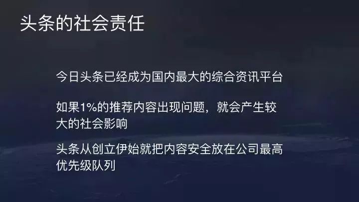 最后要介绍今日头条在内容安全上的一些举措。头条现在已经是国内最大的内容创作与分发凭条,必须越来越重视社会责任和行业领导者的责任。如果1%的推荐内容出现问题,就会产生较大的影响。