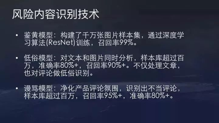 分享内容识别技术主要鉴黄模型,谩骂模型以及低俗模型。今日头条的低俗模型通过深度学习算法训练,样本库非常大,图片、文本同时分析。这部分模型更注重召回率,准确率甚至可以牺牲一些。谩骂模型的样本库同样超过百万,召回率高达95%+,准确率80%+。如果用户经常出言不讳或者不当的评论,我们有一些惩罚机制。