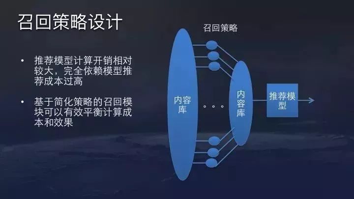 但因为头条目前的内容量非常大,加上小视频内容有千万级别,推荐系统不可能所有内容全部由模型预估。所以需要设计一些召回策略,每次推荐时从海量内容中筛选出千级别的内容库。召回策略最重要的要求是性能要极致,一般超时不能超过50毫秒。
