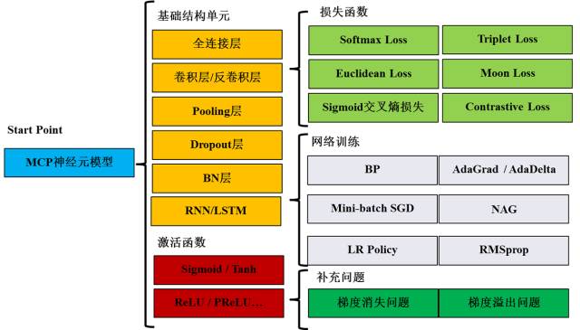 我们可以用一张图(图1)来回顾深度学习中的关键理论和方法。从MCP神经元模型开始,首先需要掌握卷积层、Pooling层等基础结构单元,Sigmoid等激活函数,Softmax等损失函数,以及感知机、MLP等经典网络结构。接下来,掌握网络训练方法,包括BP、Mini-batch SGD和LR Policy。最后还需要了解深度网络训练中的两个至关重要的理论问题:梯度消失和梯度溢出。