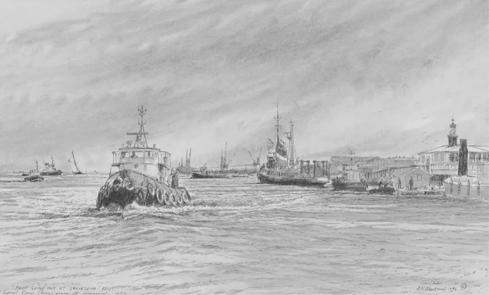 图1.1 领航员离开格雷夫森德的特勒斯码头,原作由安东尼·布莱克曼绘制
