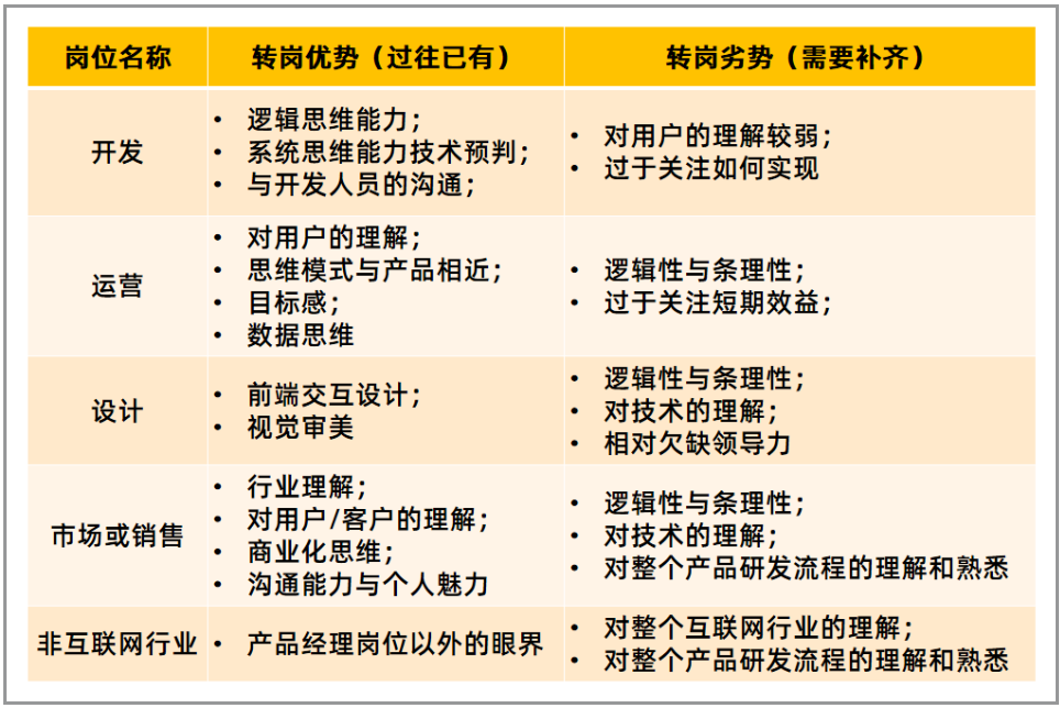 无论是运营、技术、UI设计,本身就在互联网氛围中,也是产品经理日常工作接触的一环,有天然的转岗优势。