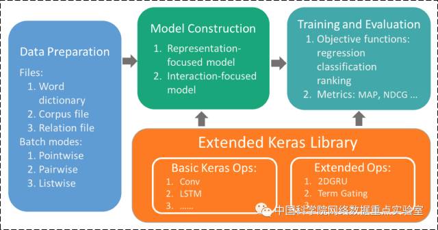 MatchZoo使用了Keras中的神经网络层,并有数据预处理,模型构建,训练与评测三大模块组成: