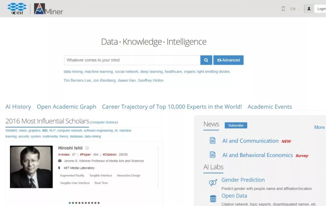 作为清华-青岛数据科学研究院科技大数据研究中心主任,清华大学计算机系李涓子老师和唐杰老师带队研发了科技情报大数据挖掘及服务平台,又名AMiner。AMiner系统可以通过对AI做领域梳理划分,再分析各细分领域的专家信息,最终实现精准学术画像,为使用者提供人才信息。系统还包含亿级学术信息,并自动分析关联的开放知识图谱,供大家用于研究。