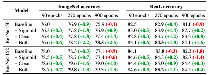 下图是在ImageNet上,由Google和DeepMind科学家提出的sigmoid loss和clean label set的Top-1精度(百分比)。