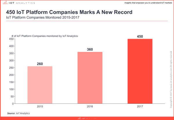 近年来,新进入者的数量继续以惊人的方式增加。在2017年夏天,IoT Analytics通过数据库跟踪市场,宣布有450家物联网平台供应商,或者至少供应商表示他们拥有物联网平台。比较:2015年,该公司认为有260个物联网平台,2016年,其数据库包含360个物联网平台。