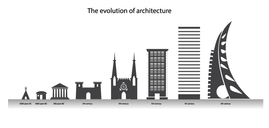 下图是建筑的演化史,在每个阶段,你可以看到设计的影子,但如果时间线拉得足够长,演化的特性就出来了。