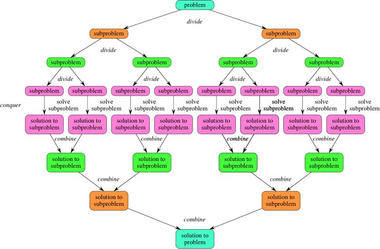 对于一个无法一次解决的大问题,我们会先把大问题分解成若干个子问题,如果子问题还无法直接解决,则继续分解成子子问题,直到可以直接解决的程度,这个是分解(divide)的过程;然后将子子问题的解组合拼装成子问题的解,再将子问题的解组合拼装成原问题的解,这个是组合(combine)的过程。