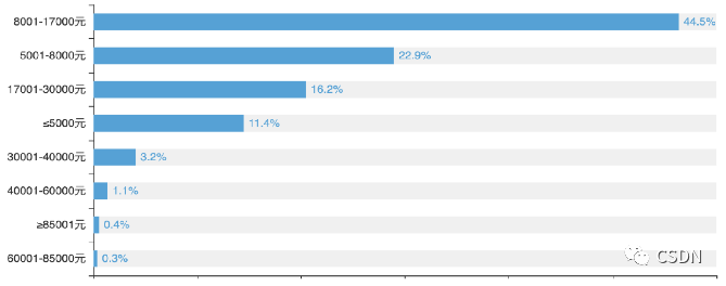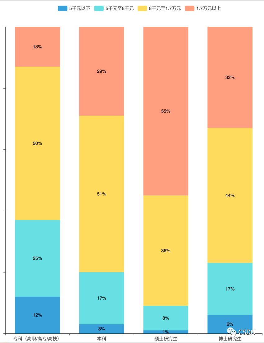从数据上来看,学历越高,高收入群体的占比也就相对较高。例如学历为硕士研究生的开发者中,薪资达到 1.7 万元以上的就有 55%。