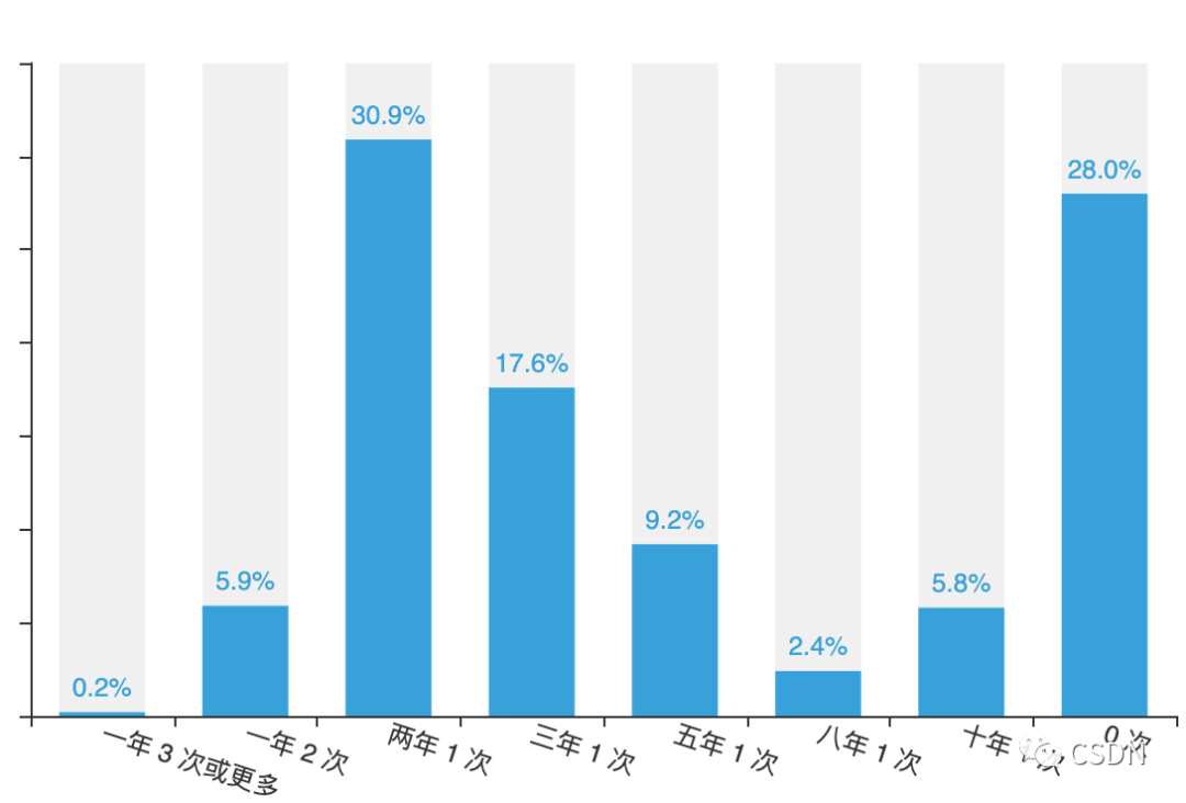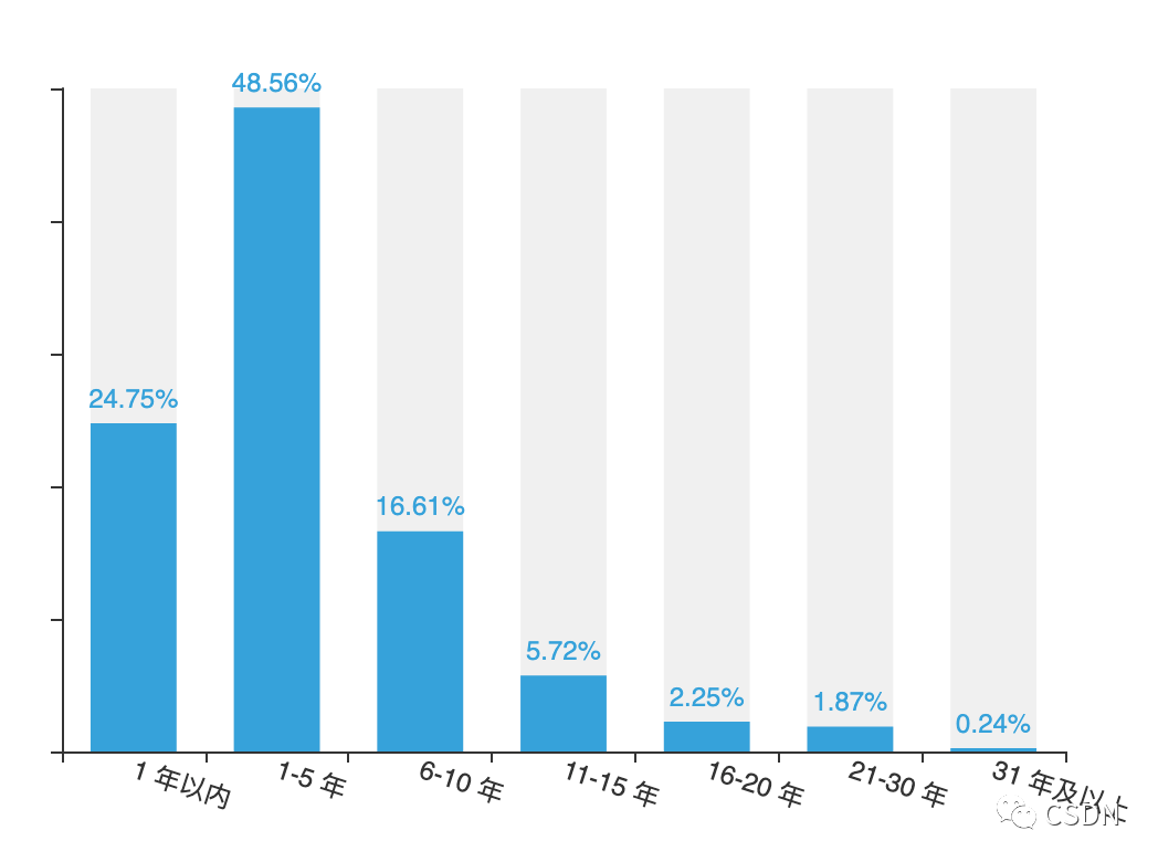 这三种方式中,在外界看来跳槽似乎是 IT 行业中很常见的现象,但如今数据证明事实并非如此:28% 的开发者表示并没有跳槽经历,甚至三年至十年才跳槽一次的开发者占比为 35%。