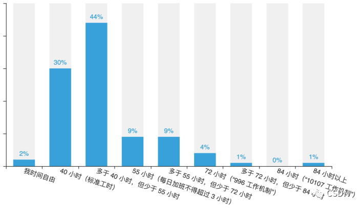 报告数据显示,按照每周 40 小时标准工时工作的程序员中,仅有 20% 的人薪资高于 1.7 万元;而工作时长在 72-84 小时的程序员中,收入超过 1.7 万元的近一半。
