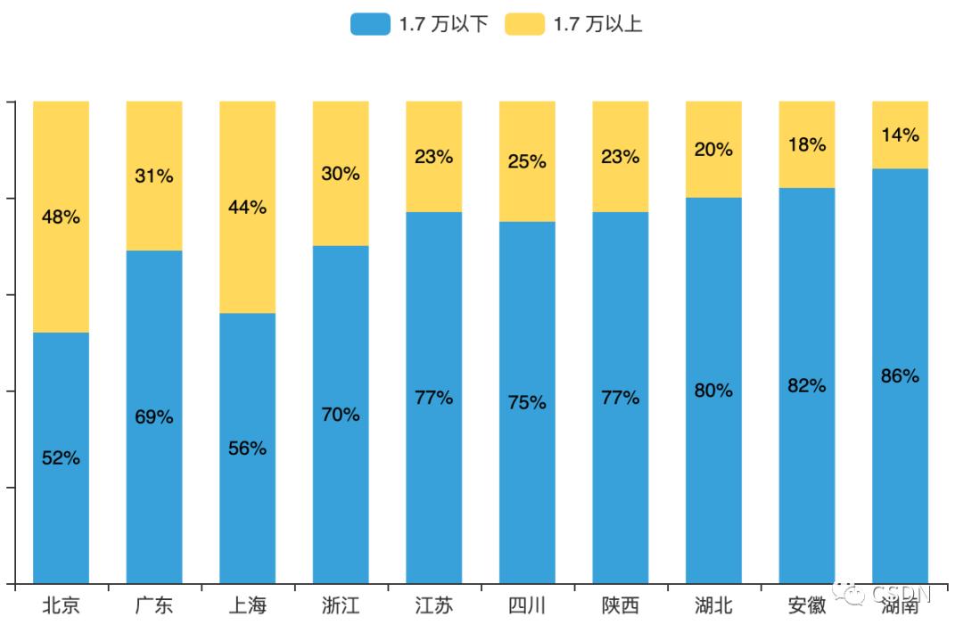 如果聚焦到具体高薪人数占比,北京和上海也占据绝对优势:近半数开发者薪资均在 1.7 万以上,反观其它地区该薪资水平仅占两成左右。