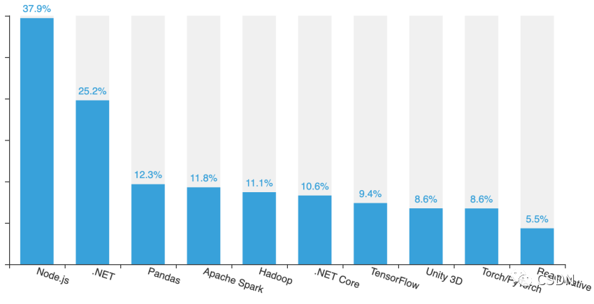 开源吞噬世界,与此同时开源工具正在吞噬开发者。数据显示,过去一年有 37.9% 的开发者在使用开源技术框架 Node.js,而作为谷歌开源的 TensorFlow 和 Facebook(现 Meta)主力支持的  PyTorch,这二者的使用占比也在缓慢上升。