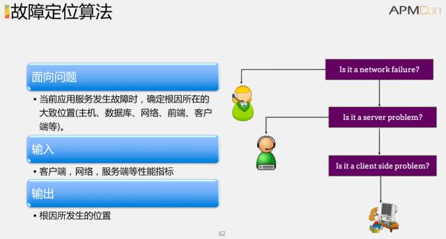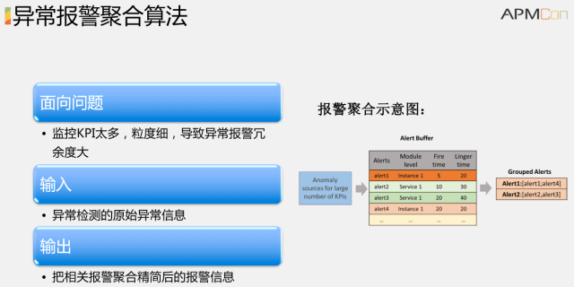 我们的算法会将各种报警原始数据聚合,比如将 100 个异常报警聚合成 5 个,这样实际处理的时候就会相对容易些。具体的算法包括基于服务、机房、集群等拓扑的层次分析,还有基于挖掘的关系和基于故障传播链的报警聚合。