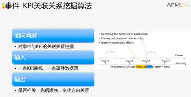 另外就是事件和 KPI 的关联关系,比如程序启动的事件,在某个时间点程序 A 启动了,下个时间点程序 B 启动了。在程序 A 每次启动的时候 CPU 利用率就上了一个台阶,而 B 没有。