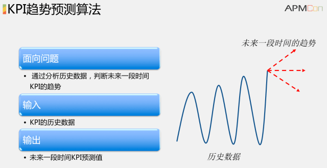 我们再分解一下,刚刚提到了异常检测的一种思路是基于 KPI 趋势预测。KPI 趋势预测就是通过时序数据的算法能预测出来 KPI 将来一段时间是什么样的,取什么值,常见的算法有 ARIMA、EWMA、Holt-Winters、时序数据分解、RNN等。