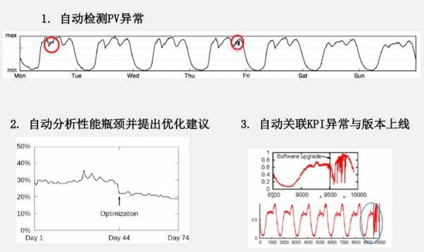 裴丹教授通过与百度运维、搜索部门的合作,分享了智能运维的三个案例,包括异常检测、瓶颈分析以及智能熔断。第一个案例是基于机器学习的 KPI 自动化异常检测。