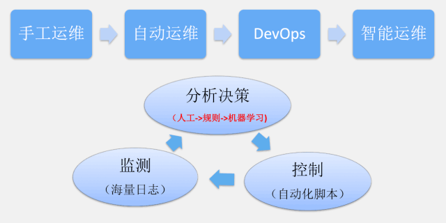 运维的发展过程,主要是分析决策步骤发生了变化:起初,由人工决策分析;后来,在采集数据的基础上,使用自动化的脚本进行决策分析;最后,用机器学习方法做决策分析。