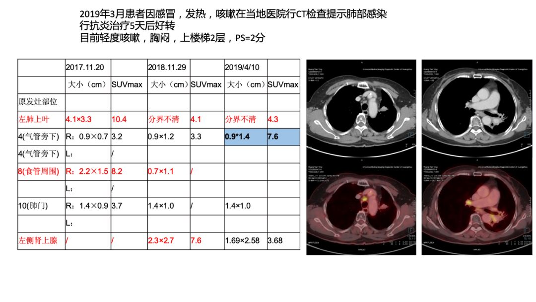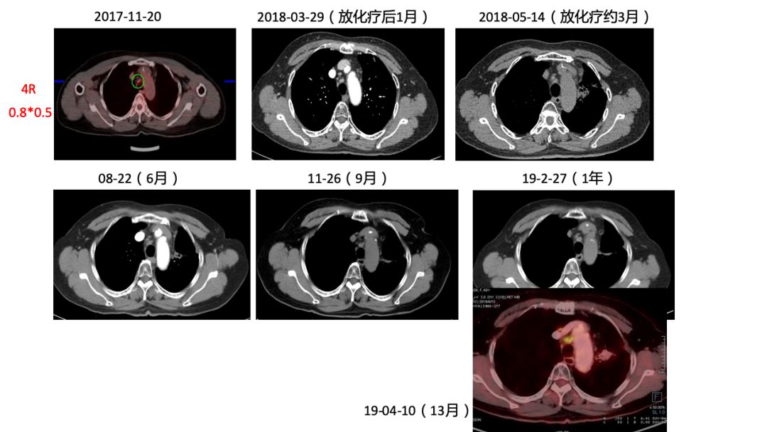 5)4R,10R组LN(非放疗区)1年来随访大小未见变化,4R实性程度增高,代谢增高2倍。