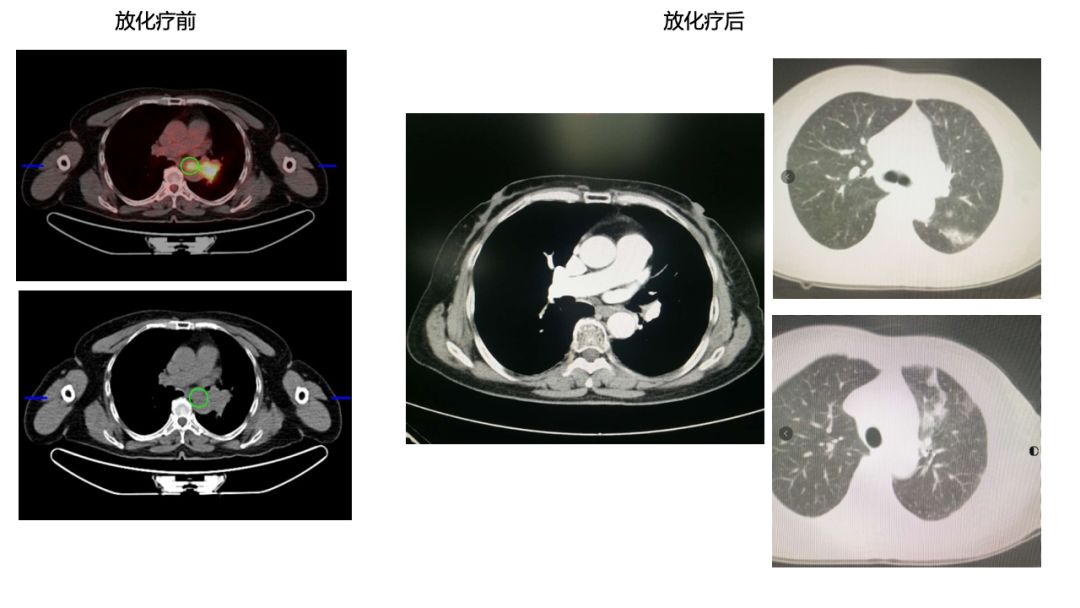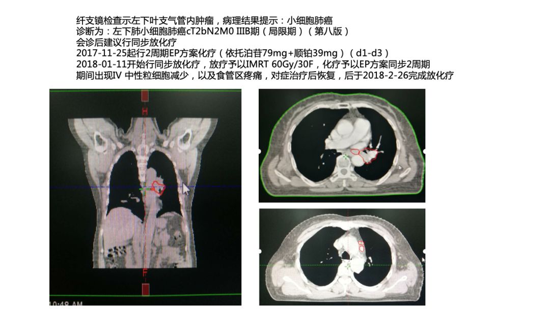 期间出现IV 中性粒细胞减少,以及食管区疼痛,对症治疗后恢复,后于2018-2-26完成放化疗。