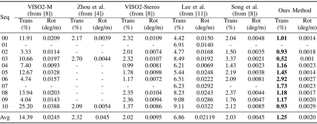 表1,我们的方法与KITTI数据集上的其它视觉里程计方法的在平移和旋转误差方面的比较。