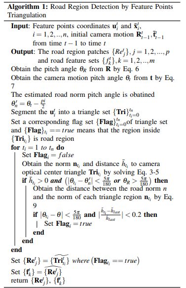 图1,本文提出的单目VO算法结构图。初始的VO过程计算初始的自运动(ego-motion)R和t¯(t¯不是绝对尺度)。道路俯仰角是道路几何模型的中心单元,它可以从自运动中被估计。使用Delaunay三角剖分方法将输入的图像帧分割成一组三角形,并通过将道路几何模型考虑进去来检查每个三角形是否属于道路区域。使用道路特征点来计算道路模型并利用相机高度信息来恢复尺度。
