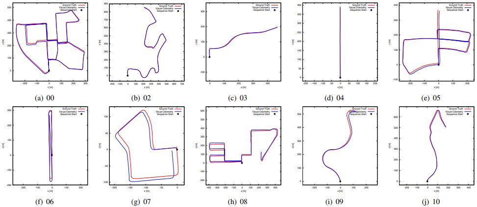 图6,在KITTI数据集的00,02~10序列上视觉里程计尺度恢复的结果。红线是真实轨迹,蓝线是我们的方法的轨迹,在02(图b)08(图h)09(图i)序列中,ORB-SLAM2在中途丢失了,因此它们对于的轨迹不完整。