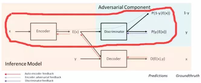 为控制属性y,增加了一个判别器(Discriminator)使得Encoder输出的E(x)不包含熟悉y的信息,即Encoder和Discriminator首先组成了一个GAN生成器判别器组合,下图红色粗线标出的网络: