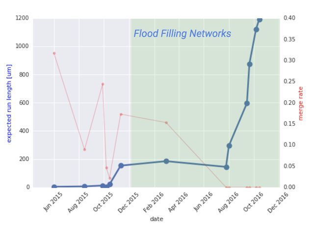 预期运行长度(蓝线)的进展带来了今天在《Nature Methods》上共享的结果。红线表示「合并率」的进展,合并率测量两个分离的神经突被错误地追踪为单个目标的频率;达到非常低的合并率对于实现手动识别和校正重建中剩余误差的有效策略至关重要。