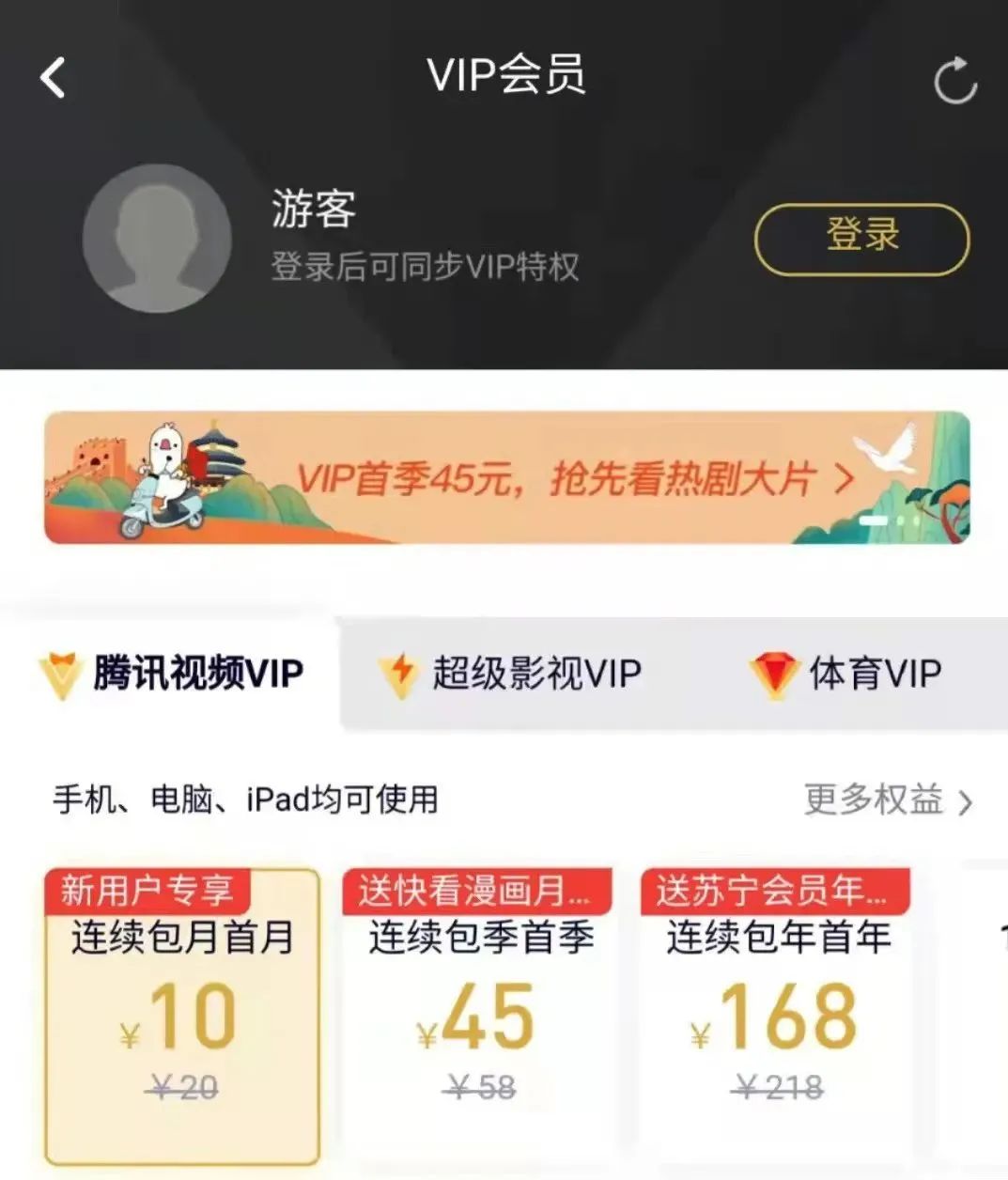 腾讯视频:连续包月20元(首月10)、连续包季58元(首月45)、连续包年218元(首月168)。