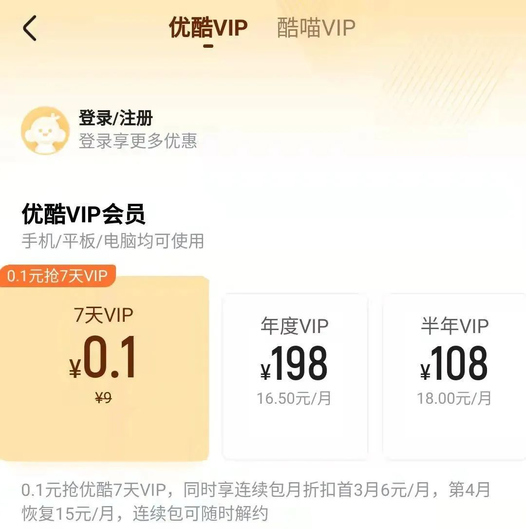 优酷:半年卡108元、包年198。